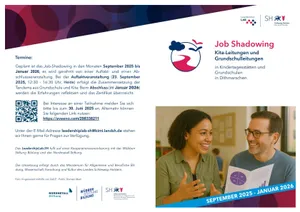 Das Job-Shadowing beginnt mit einer Auftaktveranstaltung am 23. September 2025, 12.30-16.30 Uhr in Heide. Dort lernen sich die teilnehmenden Kita-Leitungen und Grundschulleitungen kennen und finden sich zu Tandems zusammen.
